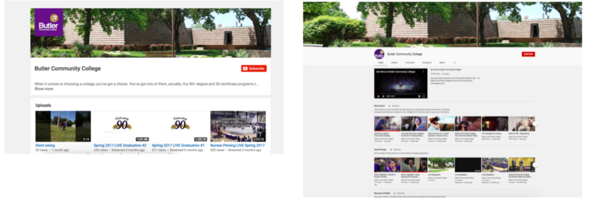 I lead an update to BCC’s YouTube strategy; on the left is roughly what the YouTube page looked like before I started, and on the right is what it resembles today: organized with subcategories and with the main welcome video on the forefront, autoplaying and greeting visitors upon page load.